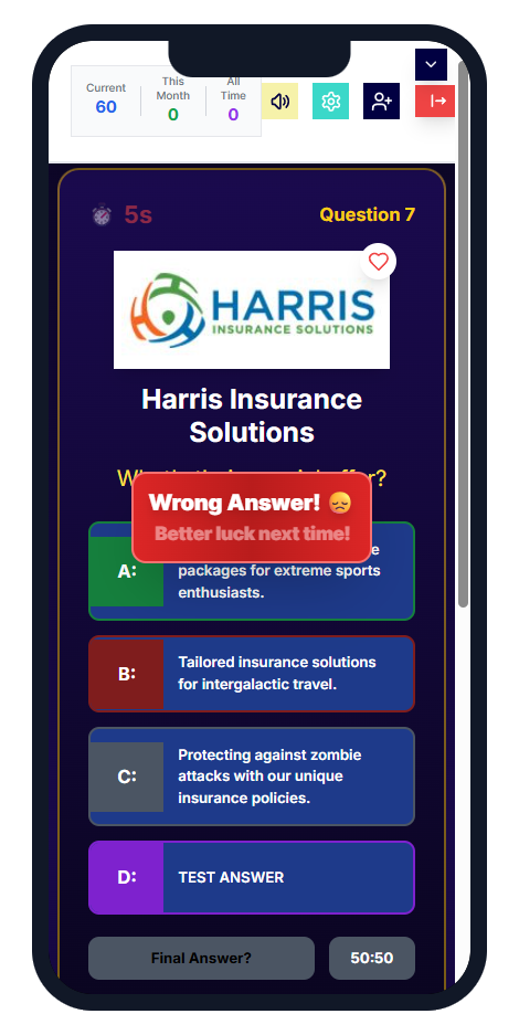 ๐ Use the 50/50 Lifeline to remove two incorrect options. You have 3 lifelines total, but they can only be used every second game.