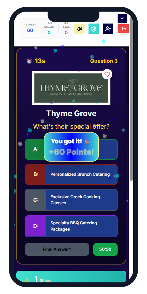 Behind the fun, Guess the Deal is also a great way for members to learn about participating businesses in an exciting and memorable way. Each game round helps you explore new brands, uncover hidden gems, and see just how much value your membership unlocks. Vendors gain valuable exposure with every play, while players enjoy an engaging way to connect with the community and rack up bragging rights on the leaderboard. With new deals added weekly and vibrant visuals that make each round pop, this isnโt just a guessing game โ itโs a gateway to discovering more ways to save and support local businesses!